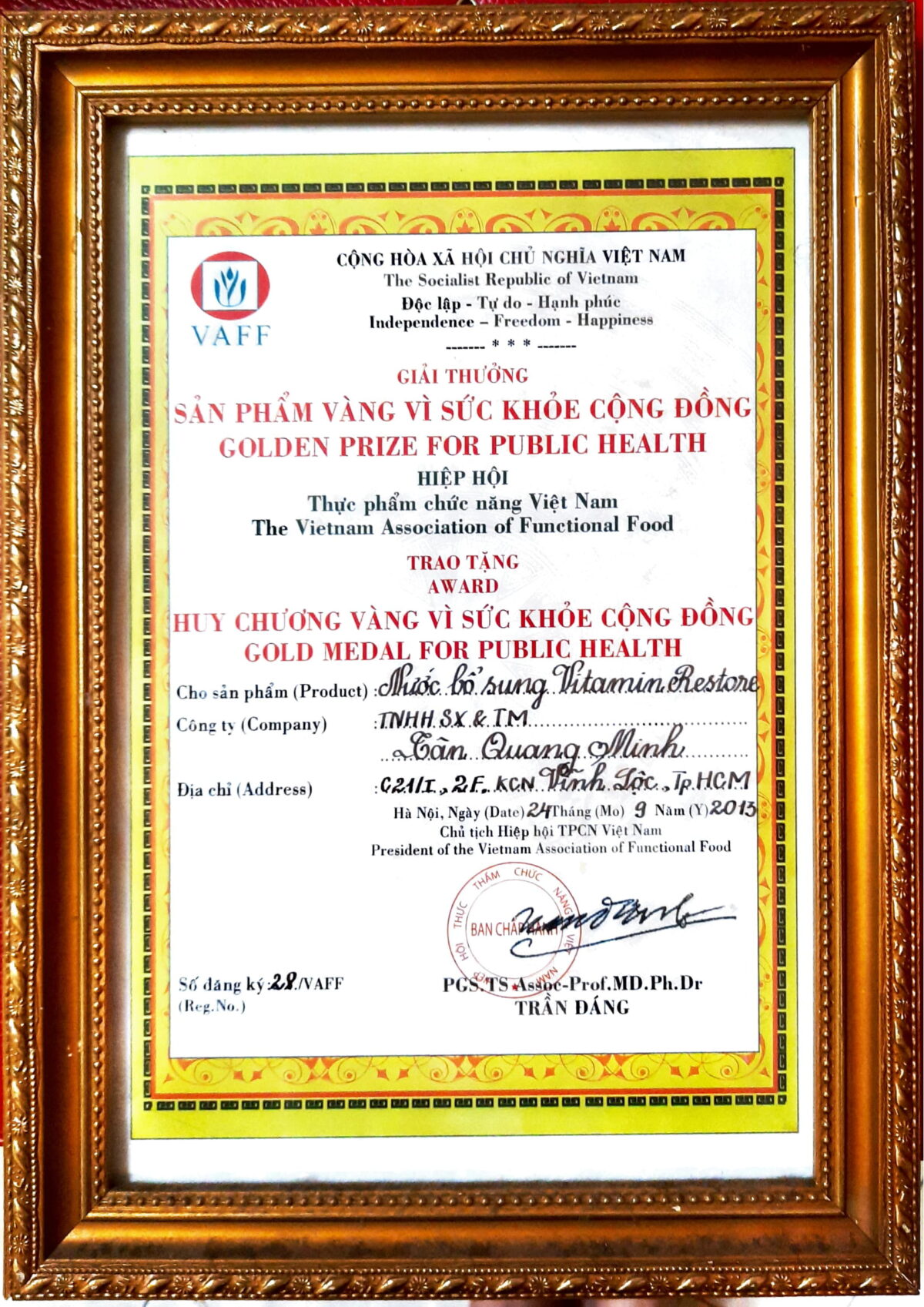 Tháng 09/2013, công ty TNHH SX&TM Tân Quang Minh – Bidrico đã vinh dự nhận được “Huy chương vàng vì sức khỏe cộng đồng cho sản phẩm Nước uống bổ sung Vitamin – Restore” do Hiệp hội Thực phẩm chức năng Việt Nam tổ chức.