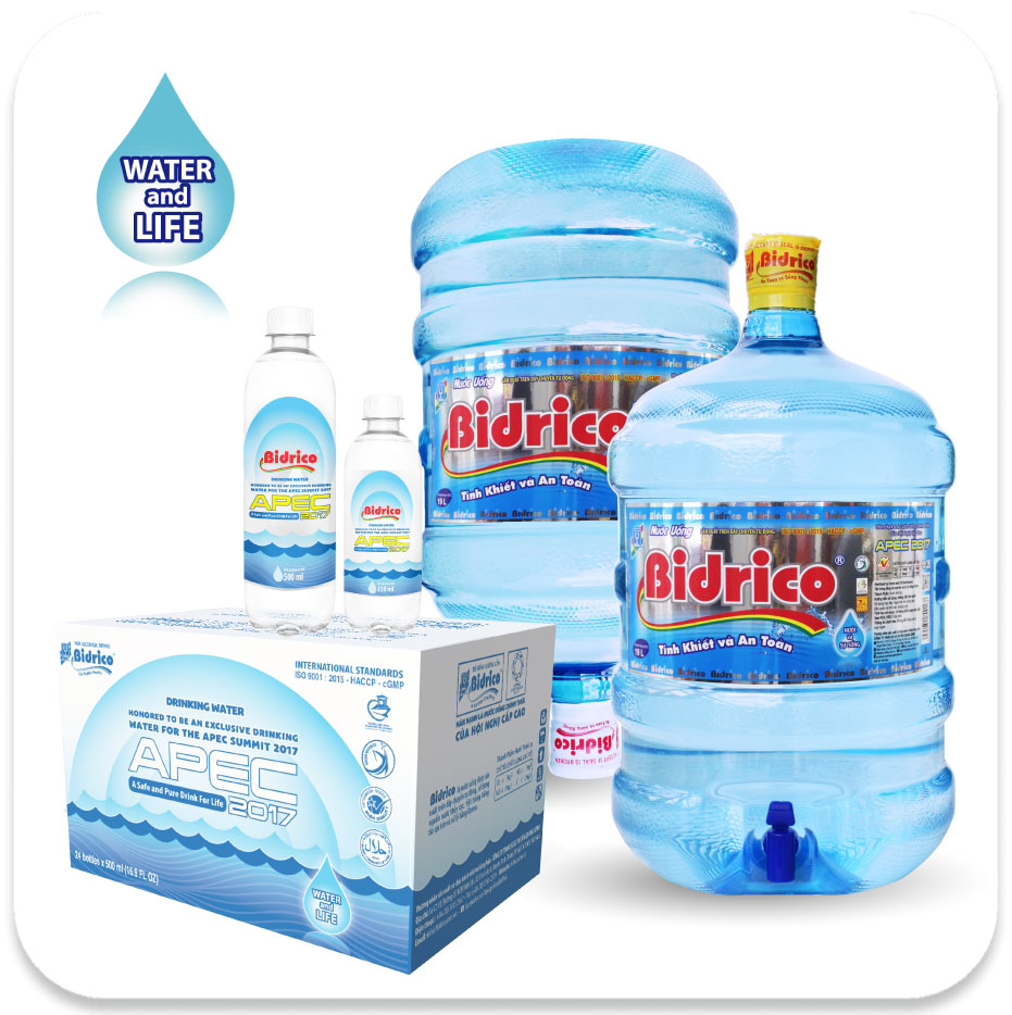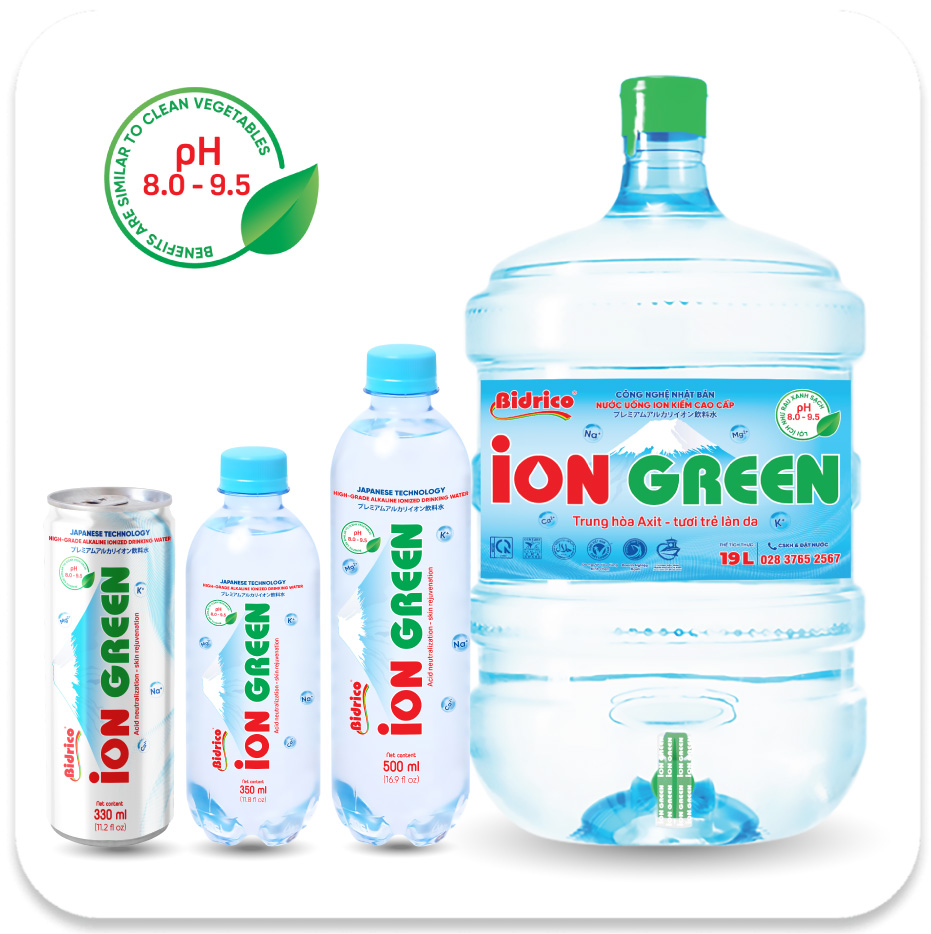 Nước uống Bidrico bình 19lNước ion kiềm Ion Green bình 19lNước uống Bidrico chai 350ml/500mlNước ion kiềm Ion Green chai 350ml/500ml/lon 330ml