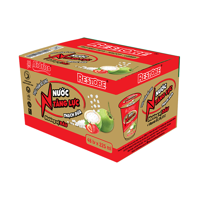 Với thiết kế nhỏ gọn, tiện lợi đựng trong ly 225ml giúp dễ dàng mang theo khi hoạt động ngoài trời. Cùng với hệ thống sản xuất an toàn và vệ sinh, nước tăng lực thạch dừa hương vị dâu Restore tự tin mang đến cho khách hàng những trải nghiệm sản phẩm tốt và chất lượng.