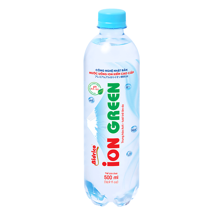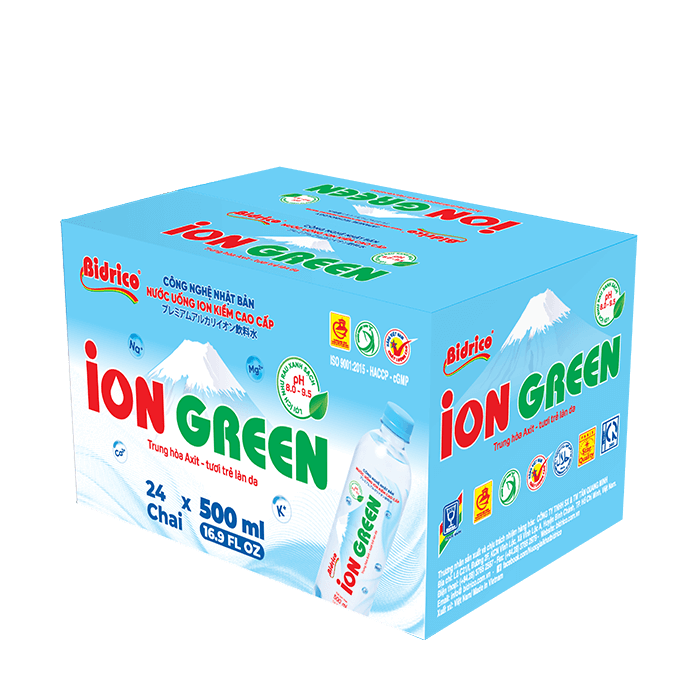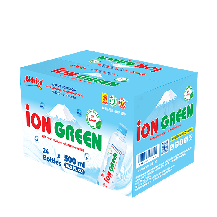 Nước uống Ion kiềm cao cấp ION GREEN chai 500ml được tạo ra từ công nghệ điện giải, tách nước thành các ion H+ và OH-, có tính kiềm tự nhiên với độ pH khoảng từ 8.0 – 9.5. Sản phẩm được sản xuất trên dây chuyền tự động, khép kín, tích hợp công nghệ điện phân hiện đại từ Nhật Bản.